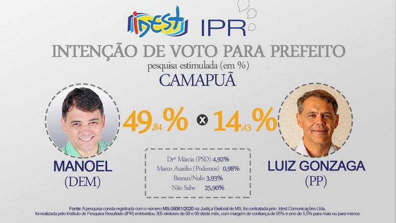 A pesquisa que consta registrada com o n�mero MS-08061/2020 na Justi�a Eleitoral de Mato Grosso do Sul foi contratada pela empresa Idest Comunica��es Ltda. Foram ouvidos 305 eleitores dias 08 e 09 de outubro, com margem de confian�a de 95% e erro de 5,5% para mais ou para menos.