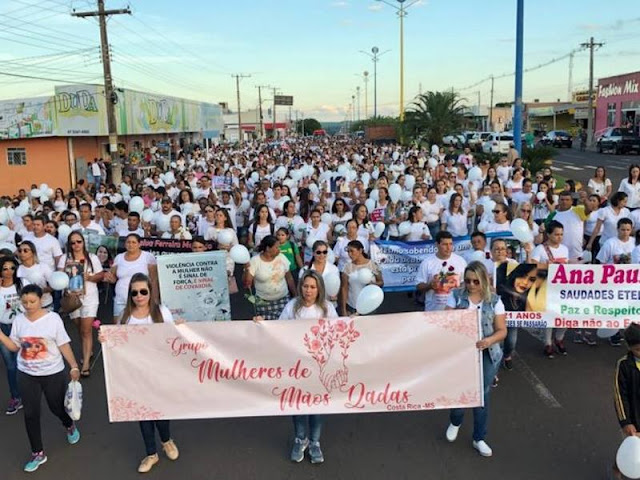 A �Caminhada Contra o Feminic�dio�, organizado pelo Grupo Mulheres de M�os Dadas, grupo criado por moradores de Costa Rica - MS, para apoiar as mulheres que sofrem viol�ncia dom�stica mobilizou na tarde de quinta-feira (21) mais de 4.000 pessoas em protesto nas ruas da cidade, segundo informou a Policia Militar e Corpo de Bombeiros do munic�pio.