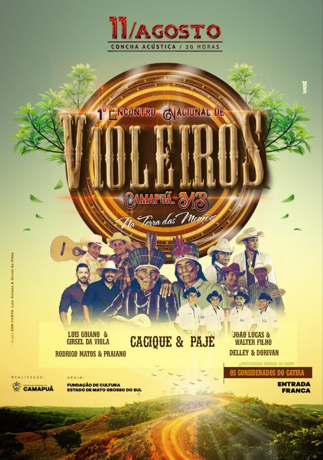 O primeiro encontro nacional dos violeiros, na terra das mon��es, acontecer� dia 11 de agosto em Camapu� e, ter� apresenta��es de duplas sertanejas, somente com viola e viol�o. Dentre os artistas, estar�o se apresentando Cacique e Paj�, a dupla mais velha em atividade no cen�rio nacional, al�m de Rodrigo Matos e Praiano, Jo�o Lucas e Walter Filho, Delley e Dorivan, Rodrigo matos e Praiano, Os Considerados do Catira (principal grupo de catira do Brasil) e uma participa��o especial, sem custo para o evento, da dupla Camapuanense Luis Goiano e Girsel da Viola.