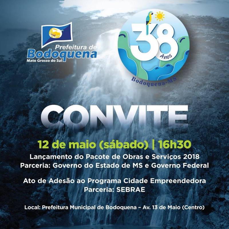 A popula��o de Bodoquena est� convida para participar do lan�amento do pacote de obras e servi�os previstos para este ano, que acontece no pr�ximo s�bado (12), �s 16h30, na sede da prefeitura municipal. Este ato marca o cronograma de celebra��o aos 38 anos de emancipa��o pol�tico-administrativa de Bodoquena, comemorado todos os anos no dia 13 de maio.