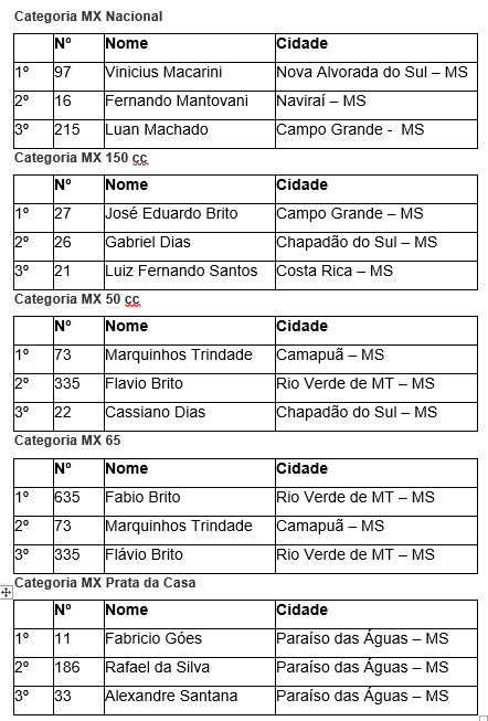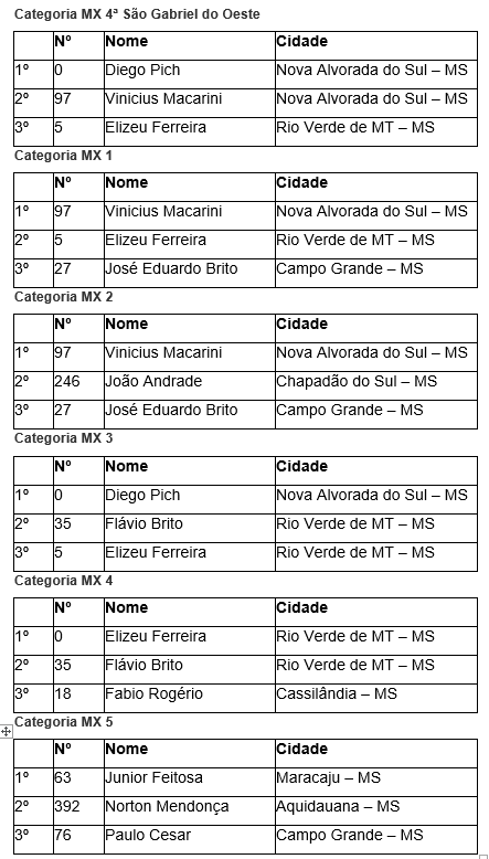 Classifica��o da 5� etapa do campeonato estadual de motocross 2017:
