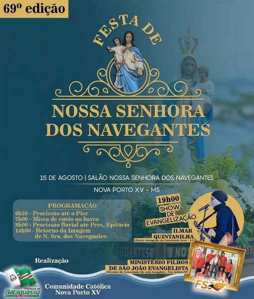 A Festa de Nossa Senhora dos Navegantes � realiza��o da Prefeitura de Bataguassu, atrav�s da Subprefeitura do Distrito de Nova Porto XV, Comunidade Cat�lica de Nova Porto XV e Col�nia de Pescadores Z-13.