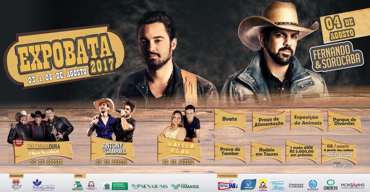 A Expobata 2017 � uma realiza��o da Associa��o Amor e Vida e Sindicato Rural de Bataguassu, com apoio da Prefeitura, C�mara de Vereadores, Governo do Estado de Mato Grosso do Sul, Senar/MS e Sistema Famasul.