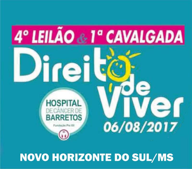 O 4� Leil�o Direito de Viver ser� realizado neste domingo dia 6 de agosto de 2017, �s 11 horas na Ch�cara Nossa Senhora Aparecida, com renda total em prol ao Hospital de C�ncer de Barretos.