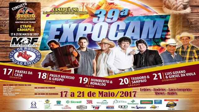 PROGRAMA��O � Suassuna destaca os itens da programa��o que colocam a Expocam entre as mais atrativas feiras do g�nero. Os shows musicais agendam, a partir de quarta-feira, 17, com fechamento no domingo, 21, festejados nomes da m�sica local e nacional. A abertura, dia 17, ficar� a cargo dos talentos camapuanenses, confirmando o potencial art�stico do munic�pio. Depois se apresentar�o, pela ordem, Paulo Mer�sio e a Noite do Chamam� (dia 18); Humberto & Ronaldo, com o sertanejo universit�rio (19); Teodoro & Sampaio (20); e a chave de ouro no domingo, com o retorno aos palcos da dupla Luiz Goiano & Girsel da Viola, que voltaram a cantar e tocar juntos.