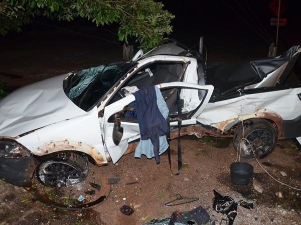 | Fiat Strada ficou destru�da ap�s colis�o na sede da pol�cia. (Foto: IviNot�cias) |