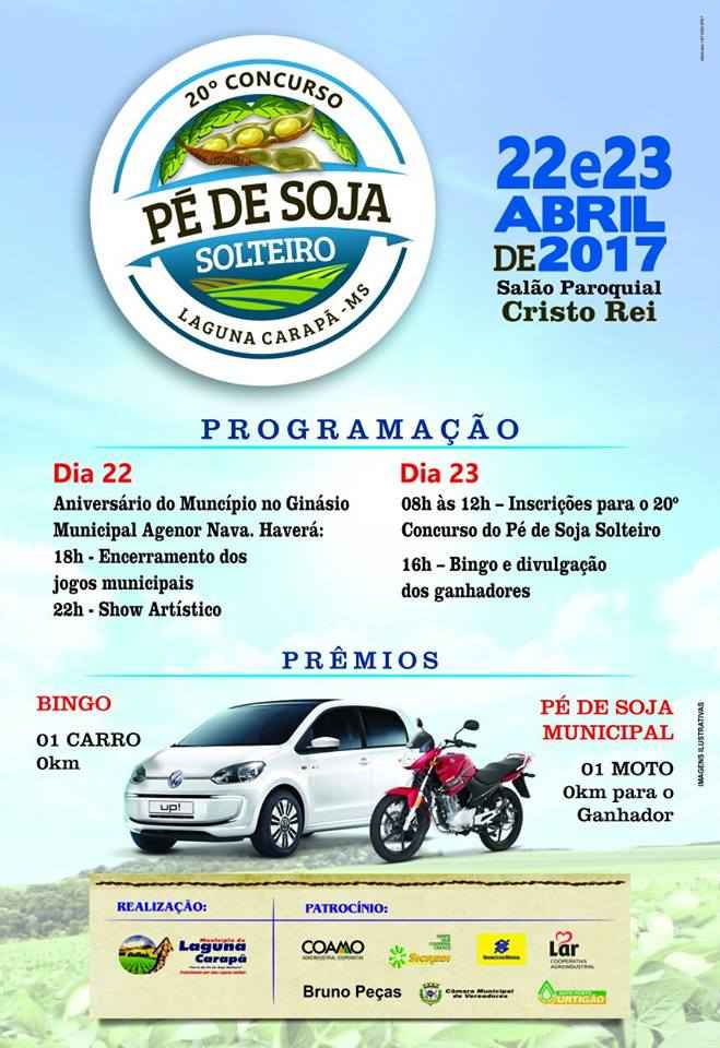 No domingo, dia 23, a Festa segue com o 20� Concurso do P� de Soja Solteiro, evento tradicional que tornou a cidade conhecida nacionalmente, com a premia��o de uma moto 0 km para o ganhador da categoria municipal e o sorteio de um carro 0 km no bingo ente todos os participantes inscritos.