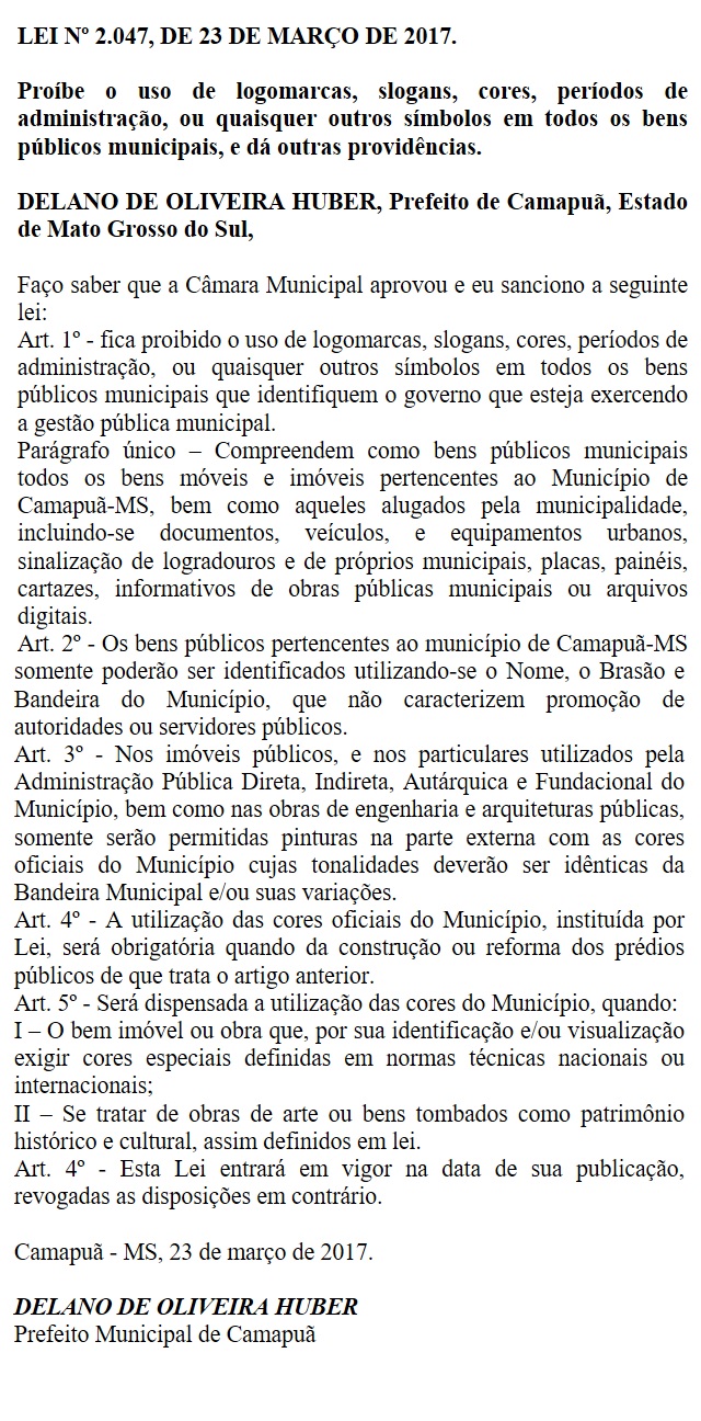 CAMAPUÃ| Prefeito sanciona lei que proíbe uso de logomarcas de governo