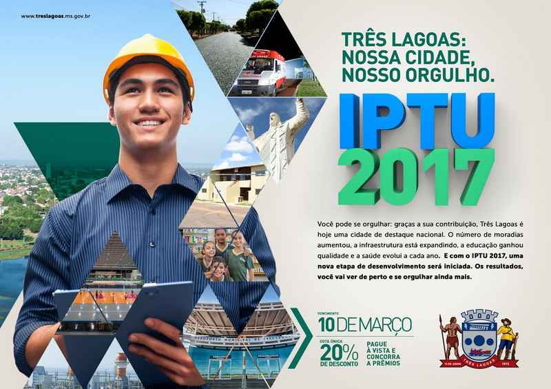 A primeira parcela do Imposto Predial e Territorial Urbano (IPTU) 2017, de Tr�s Lagoas vence no dia 10 de mar�o. O pagamento total � vista possui um desconto de 20%, podendo ser efetuado em Casas Lot�ricas, bancos ou conv�nios banc�rios, at� a data de vencimento.