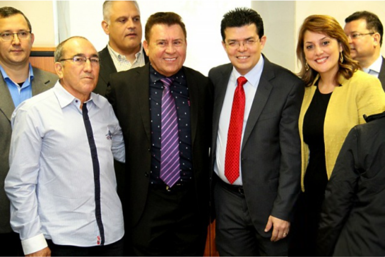 | Valdir Gomes (terno preto e grava roxa) ao lado de Olarte e da primeira dama Andr�a. (Foto: Marlon Ganassin/PMCG) |
