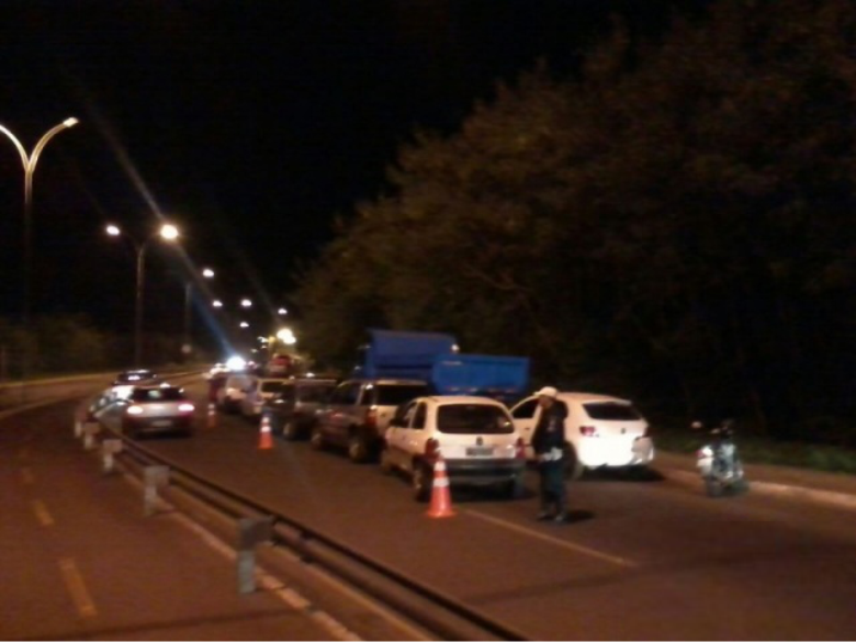 Durante a madrugada de hoje (7), 23 ve�culos foram recolhidos em blitz, na Avenida Ernesto Geisel, logo ap�s o viaduto da Avenida Mascarenhas de Moraes. A fiscaliza��o foi feita para conscientizar os condutores em fun��o da movimenta��o do pessoal que deixava a festa Junina da UCDB (Universidade Cat�lica Dom Bosco).