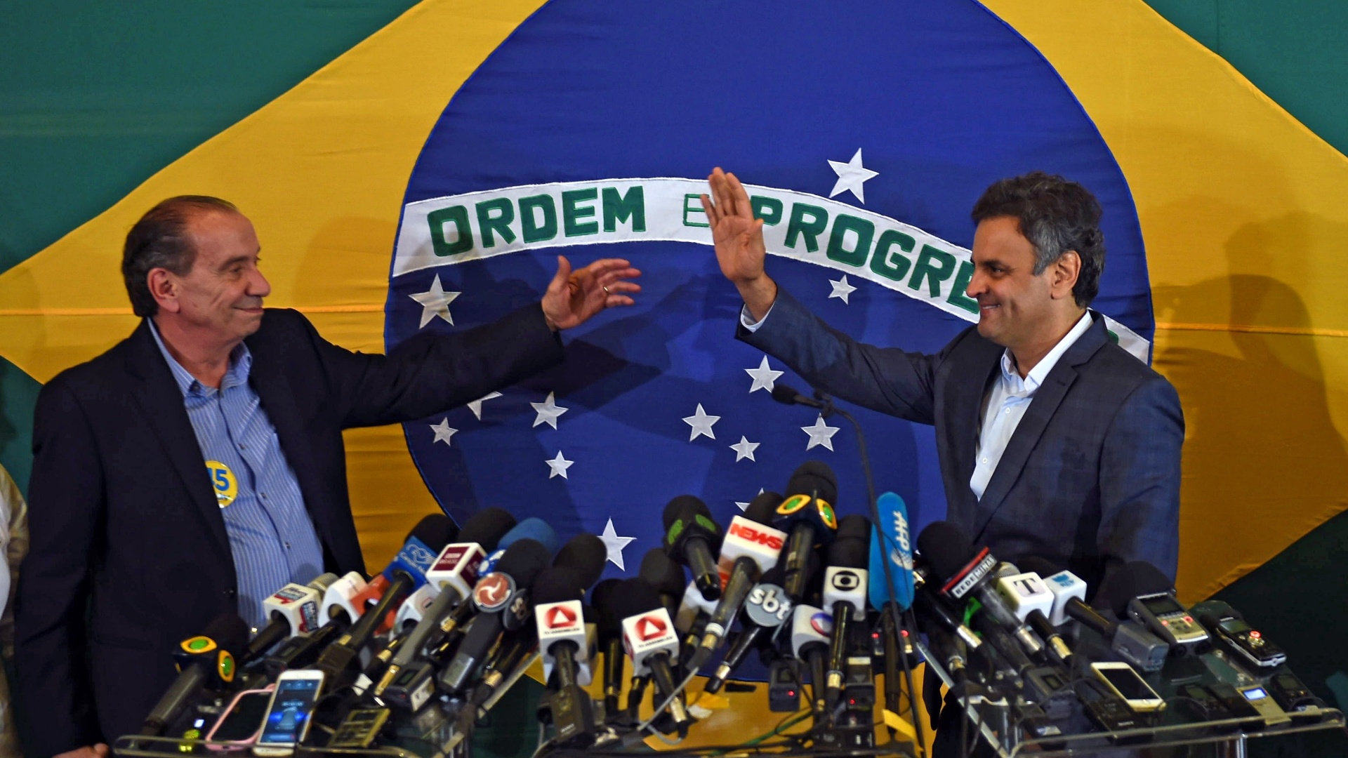 26.out.2014 - O candidato derrotado � Presid�ncia pelo PSDB, A�cio Neves (dir.), cumprimenta seu candidato a vice na chapa, Aloysio Nunes (PSDB), em entrevista concedida ap�s o reconhecimento da derrota para a candidata do PT, Dilma Rousseff neste domingo (26). "Cumpri minha miss�o", disse ele Yasuyoshi Chiba/AFP