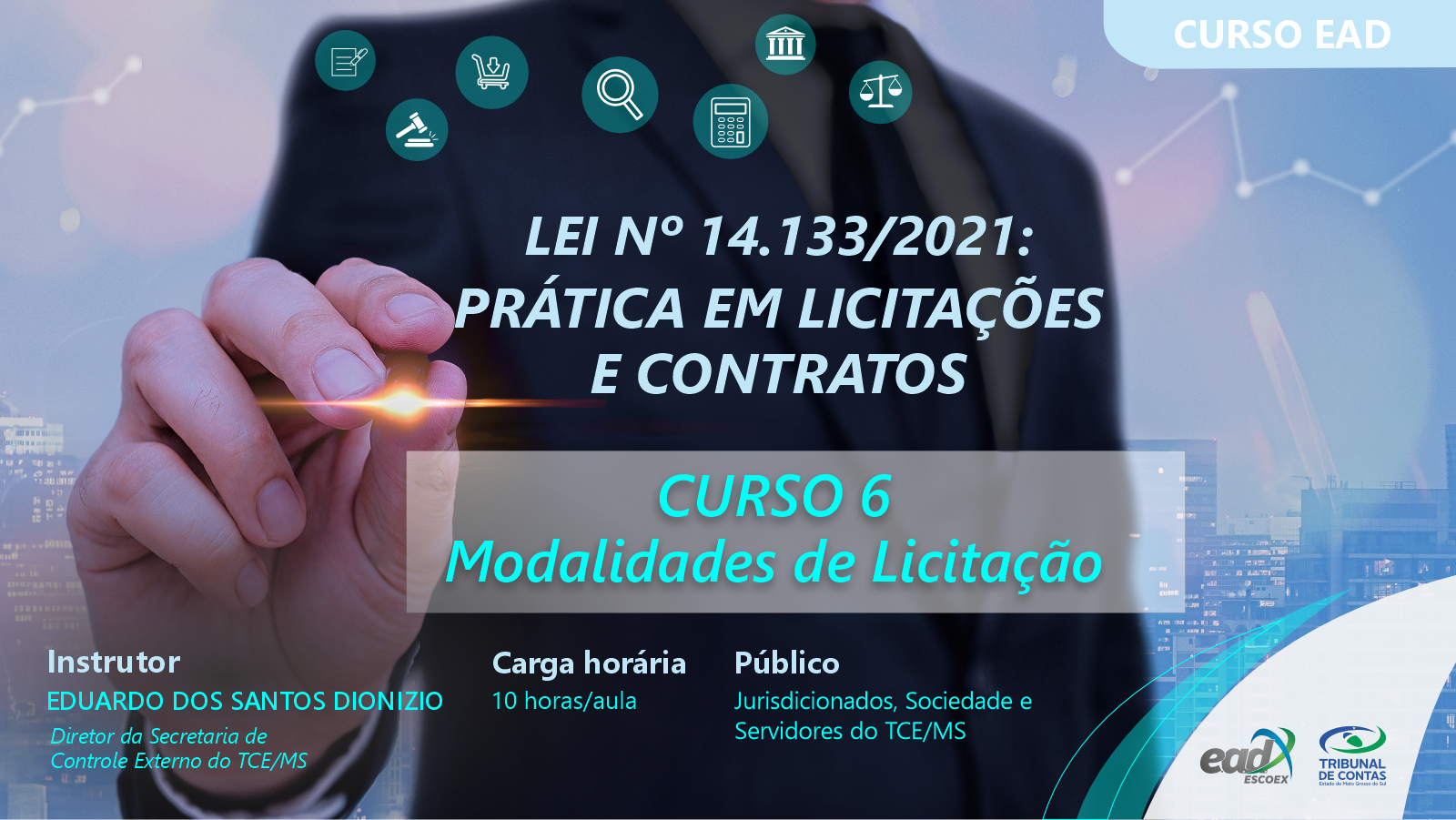No curso 6 o tema a ser abordado é “Modalidades de licitação”. As aulas são ministradas pelo corpo técnico do TCE/MS, disponibilizadas semanalmente.