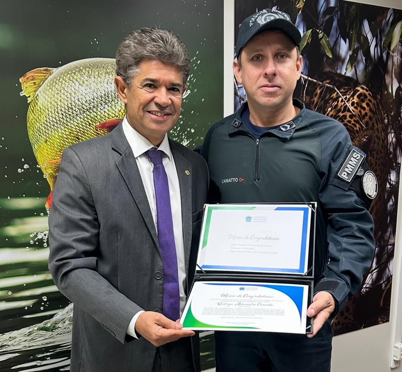 O deputado estadual Professor Rinaldo Modesto (Podemos) entregou, na quarta-feira (6), uma moção de congratulação ao Cabo Rodrigo Alexandre Caniatto, do Centro de Operações da Polícia Militar (COPOM), em reconhecimento à sua atuação exemplar durante o atendimento de uma ocorrência de violência doméstica.