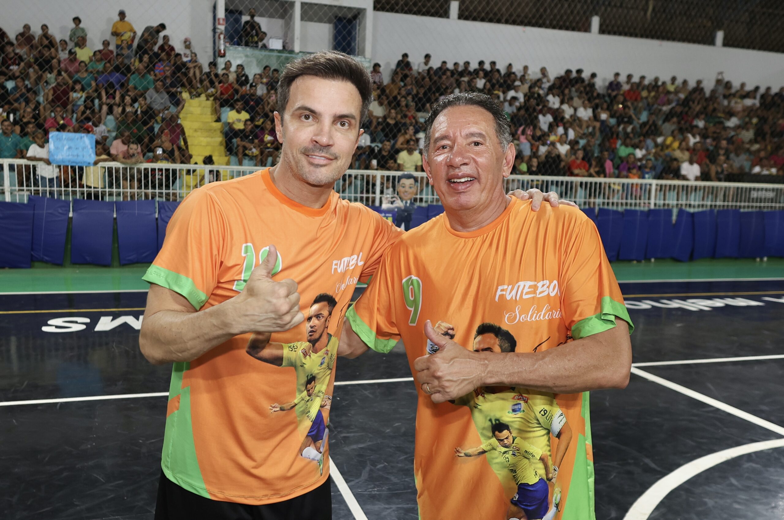 Gerson Claro e o craque Falcão participaram do Futebol Solidário, que movimentou o Ginásio de Miranda com ações sociais e esporte