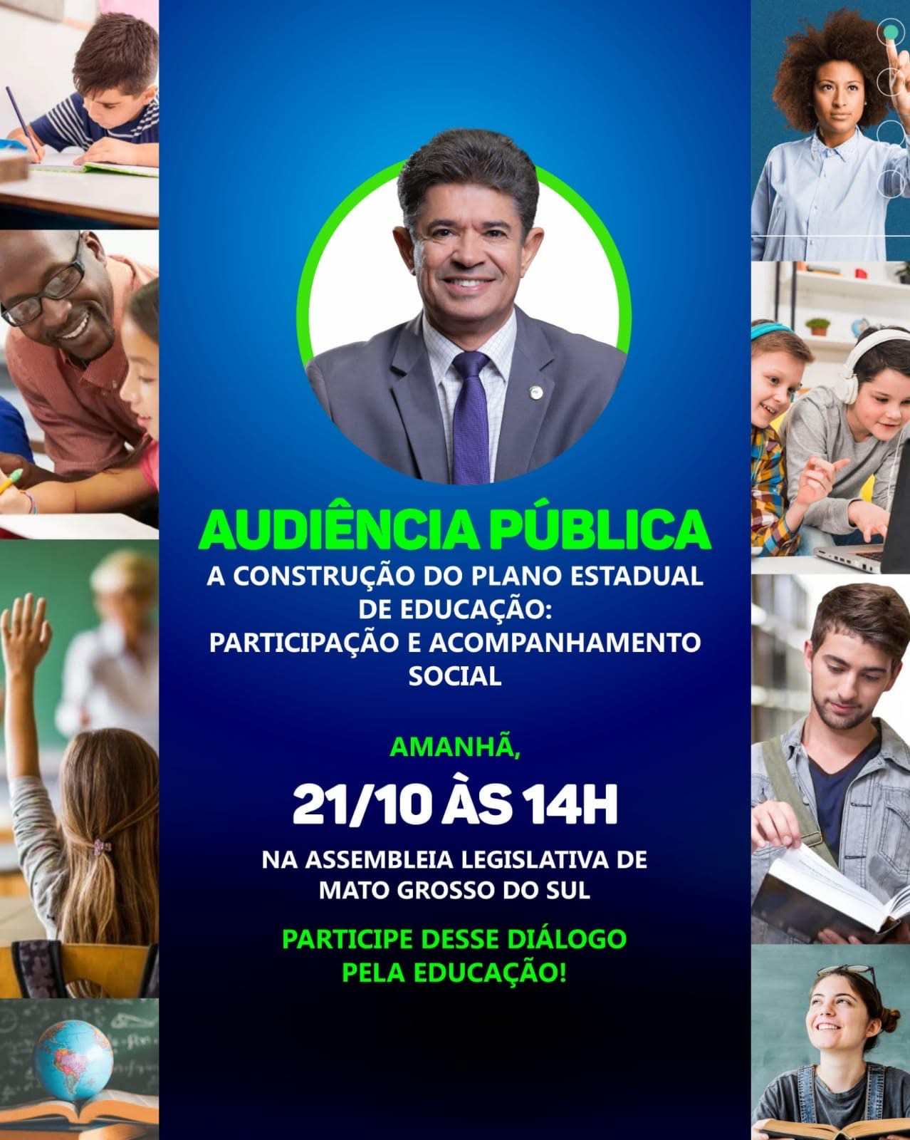 O deputado estadual Professor Rinaldo Modesto (Podemos), presidente da Comissão Permanente de Educação, Cultura e Desporto da Assembleia Legislativa de Mato Grosso do Sul (ALEMS), realiza nesta terça-feira (21), às 14h, a audiência pública “A Construção do Plano Estadual de Educação: Participação e Acompanhamento Social”. O encontro acontece no Plenário Deputado Júlio Maia, na sede da ALEMS, com transmissão ao vivo pela TV ALEMS e pelas redes sociais da Casa de Leis.