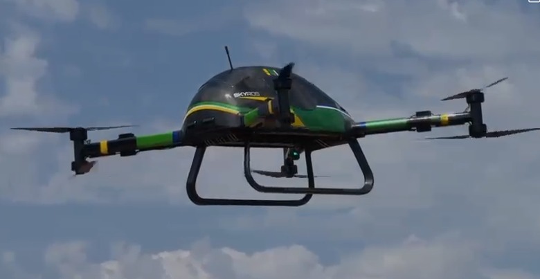 O Skyros é uma aeronave elétrica de decolagem e pouso vertical (eVTOL), com 5 metros de envergadura, 3,8 metros de comprimento, 1,25 metros de altura e peso total de 700 kg. Possui capacidade para transportar 400 litros de insumos agrícolas e operar de forma remota em até 20 km de distância. Além disso, pode ser configurado para voo totalmente autônomo, realizando mapeamento aéreo da área, programação de horários de acionamento, decolagem e retorno à base.