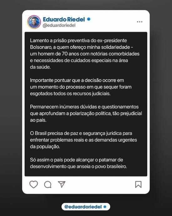 No texto, Riedel destacou que Bolsonaro, de 70 anos, possui comorbidades e necessita de cuidados especiais. O governador afirmou ainda que a decisão judicial ocorre em um momento do processo em que “nem todos os recursos foram esgotados”, o que, segundo ele, alimenta dúvidas e pode aprofundar a polarização política no país.