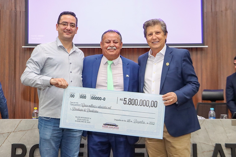 Durante a sessão da Câmara, o prefeito recebeu ainda o cheque simbólico de R$ 5.800.000,00 referentes ao duodécimo economizado ao longo do exercício de 2025, recurso que retorna aos cofres do município e reforça o equilíbrio financeiro da administração.