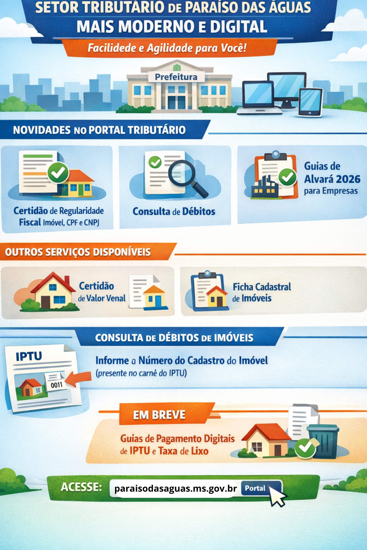 O acesso aos serviços pode ser feito diretamente no site oficial da Prefeitura de Paraíso das Águas, por meio do Portal Tributário disponível na página principal.