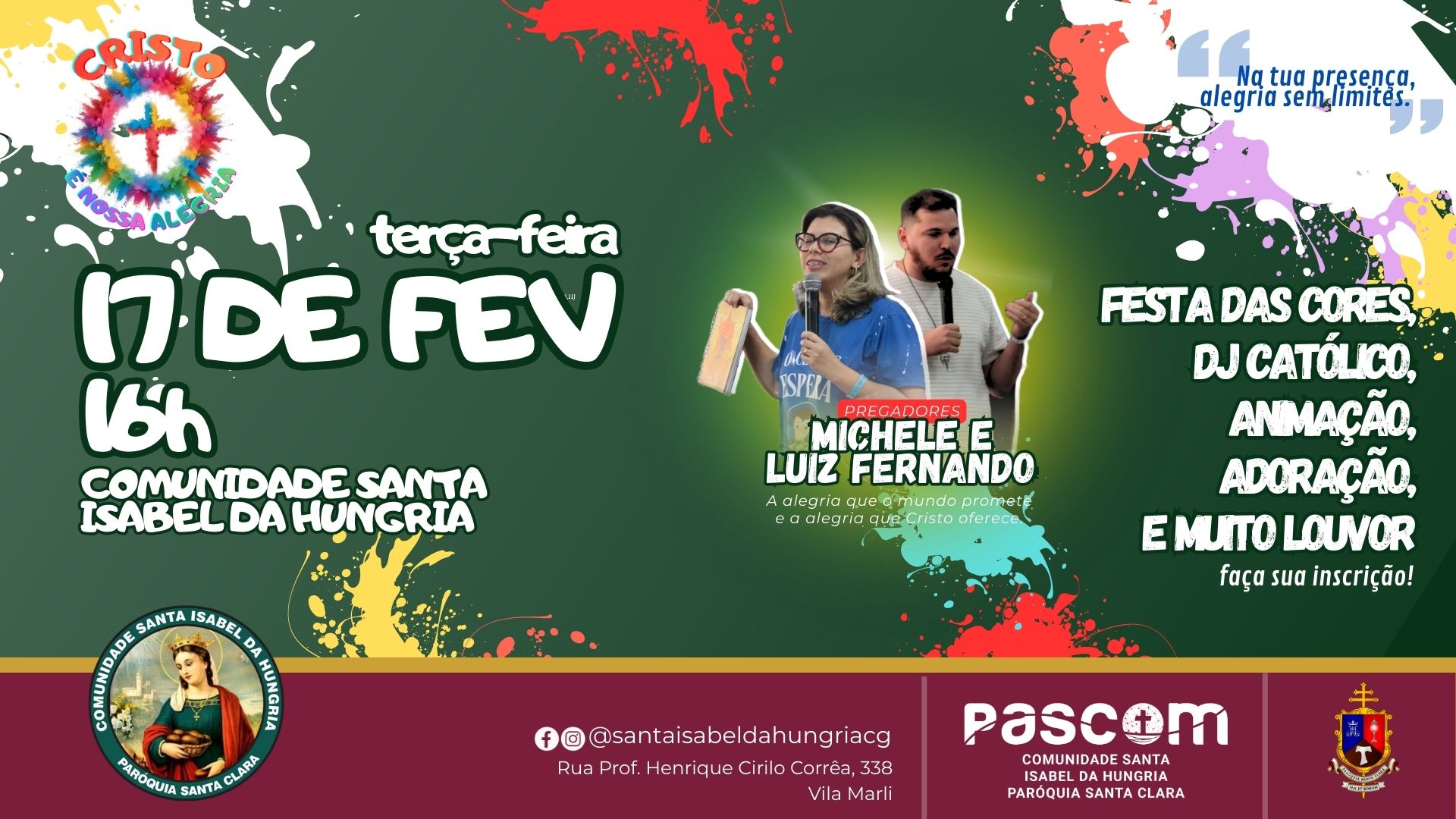 Em meio ao ritmo intenso e às celebrações do Carnaval, uma proposta diferente surge como opção para os jovens que desejam viver uma alegria que vai além do momento passageiro. Na próxima terça-feira, 17 de fevereiro, às 16h, a Comunidade Santa Isabel da Hungria promove o encontro “Cristo é a Nossa Alegria”, uma experiência que une música, animação, espiritualidade e convivência fraterna.