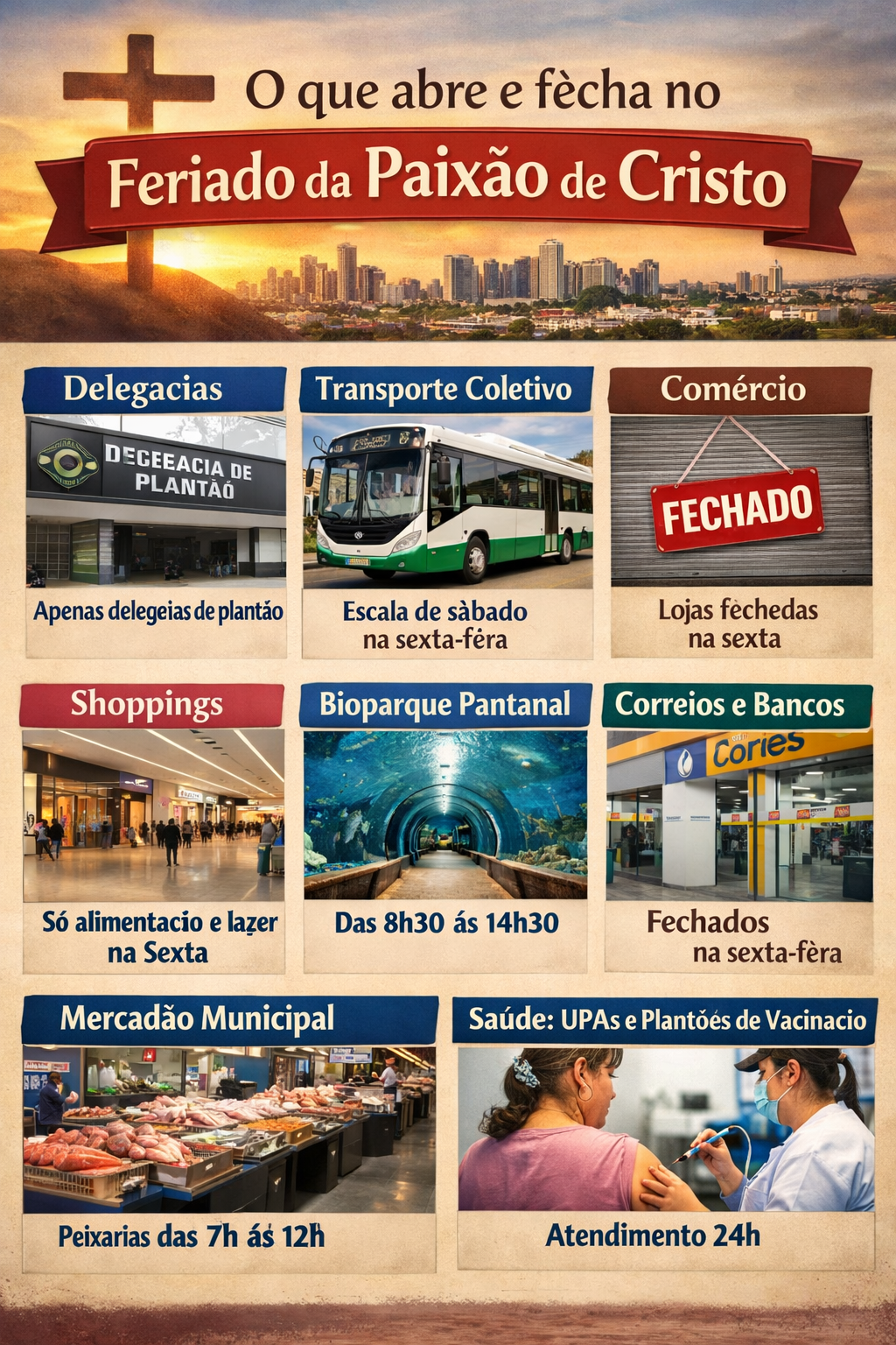 A partir desta quinta-feira (2), moradores de Campo Grande devem ficar atentos às mudanças no funcionamento de serviços essenciais por conta do feriado da Paixão de Cristo, celebrado na sexta-feira.